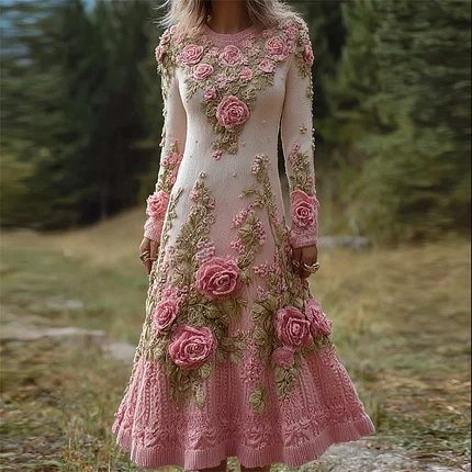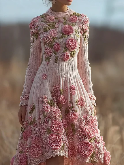Classy Pink Roses Beaded Cozy Knit Sweater Dress