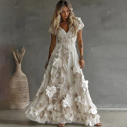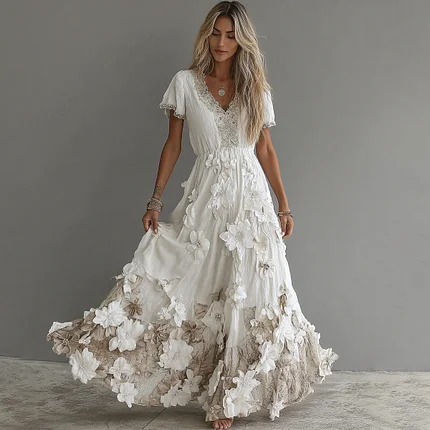 Women’s Vintage Boho Floral Art Short-sleeved Maxi Dress