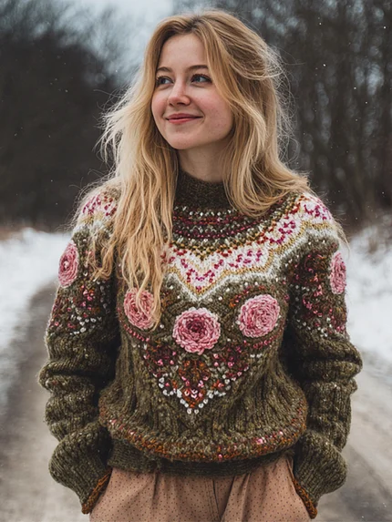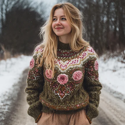 Vintage Floral Knit Embroidered Art Women’s High-neck Icelandic Sweater