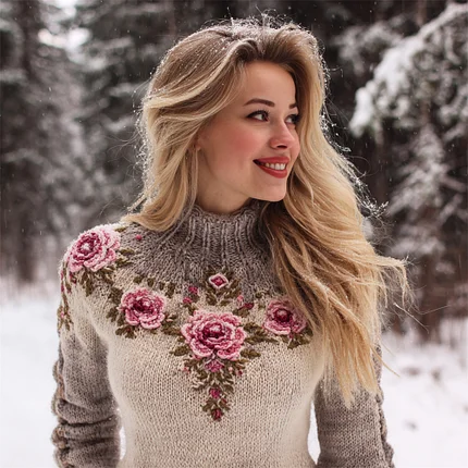 Vintage Rose Knit Embroidered Art Women’s High-neck Icelandic Sweater