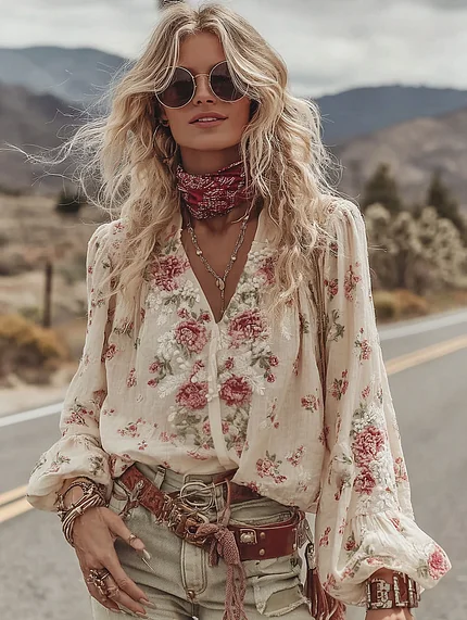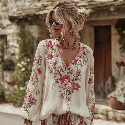 Women’s Vintage Rose Art Pattern V-neck Blouse