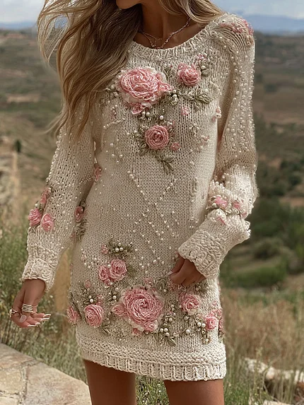 Women’s Vintage Rose Art Cozy Knit Mini Sweater Dress