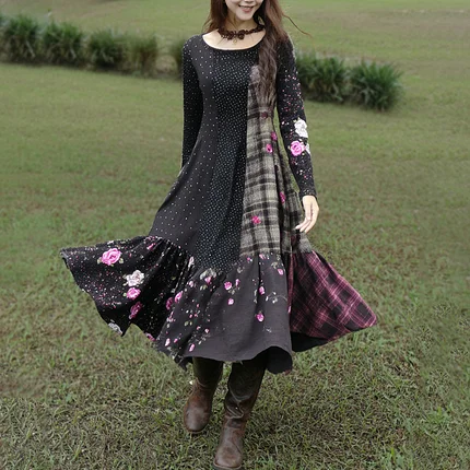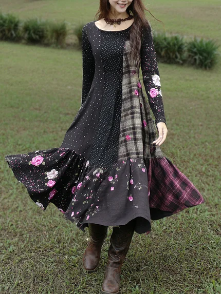 Women’s Vintage Polka Dot And Rose Floral Plaid Patchwork Linen Dress