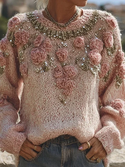 Vintage Boho Roses Embroidered Glitter Cozy Knit Sweater