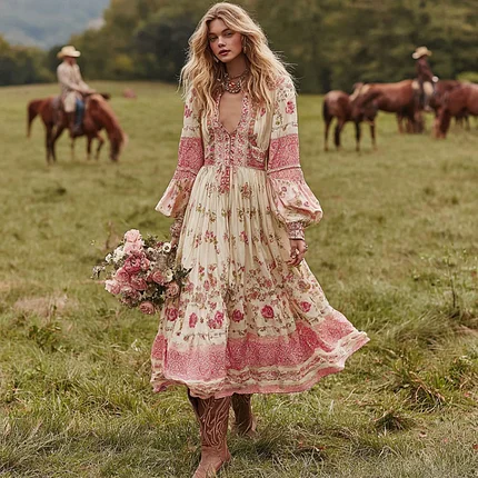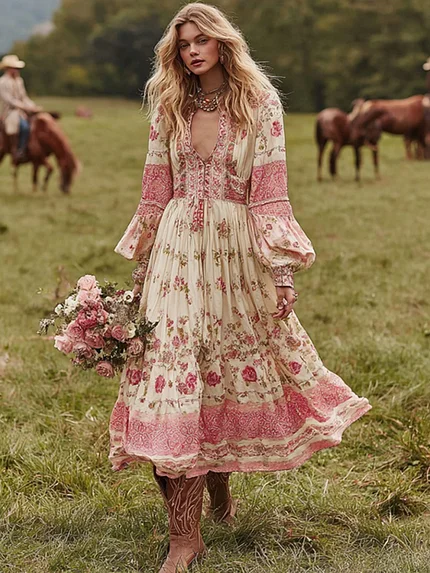 Women’s Bohemian Cherry Blossom Pattern Casual Round Neck Long Sleeve Dress