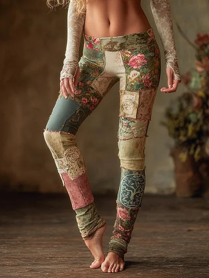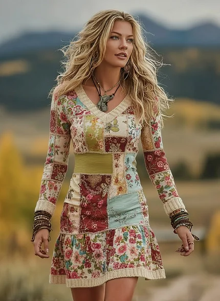 Women’s Vintage Patchwork Floral Art Cozy Knit V Neck Mini Sweater Dress