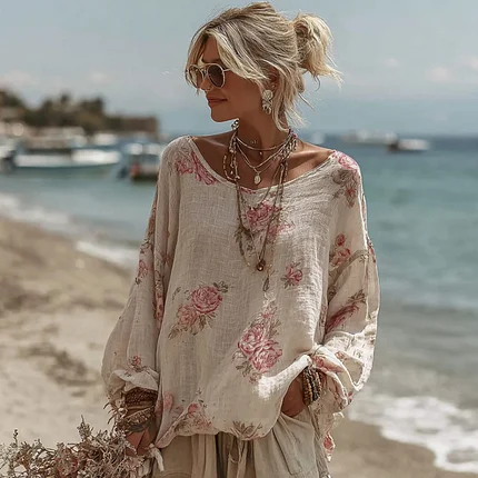 Elegant Boho Roses Pattern V Neck Flowy Linen Maxi Dress