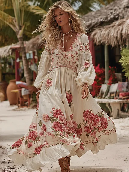 Women’s Vintage Rose Printed Art V-neck Long Sleeve Maxi Dress