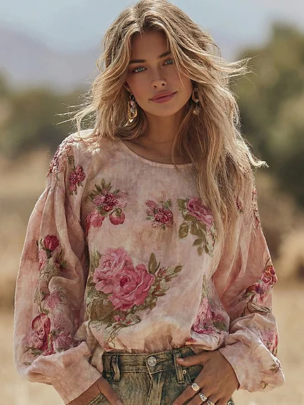 Women’s Vintage Pink Rose Print Linen Blend T-shirt