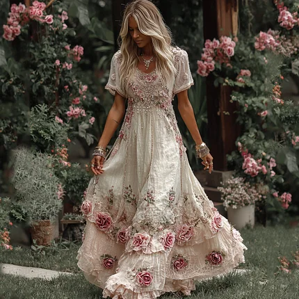 Women’s Vintage Rose Floral Embroidery Art Casual Maxi Dress