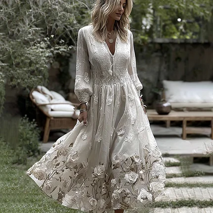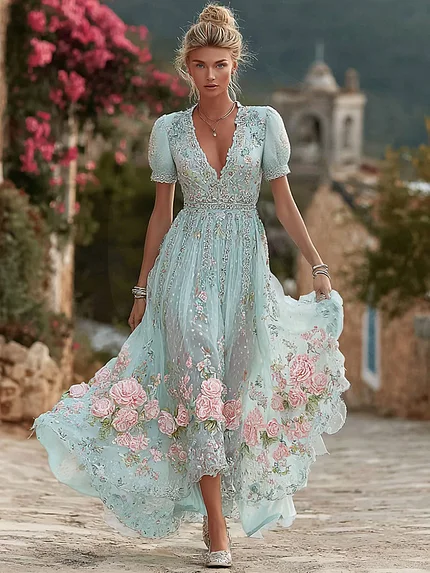 Women’s Vintage Rose Floral Embroidery Art Casual V Neck Maxi Dress