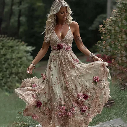 Women’s Vintage Rose Floral Embroidery Art V-neck Suspender Maxi Dress