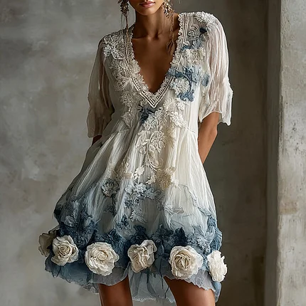 Women’s Retro White Rose Embroidery Pattern Gradient Short Sleeve Dress