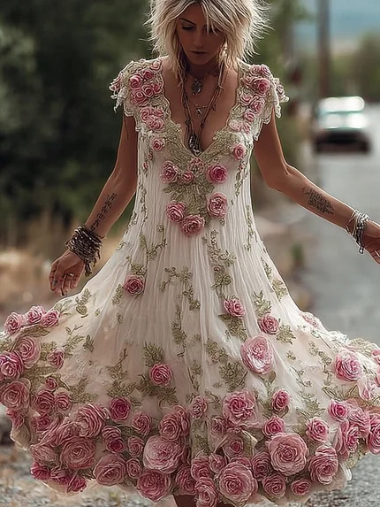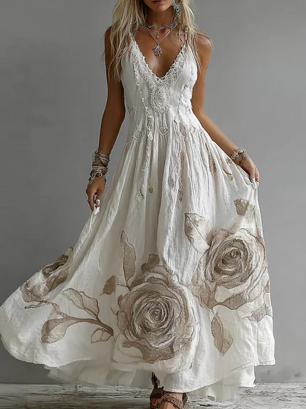 Women’s Vintage Rose Floral Embroidery Art Casual V Neck Maxi Dress