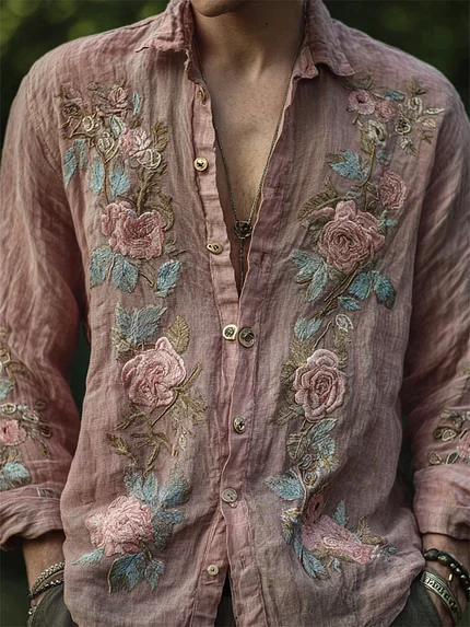Men’s Boho Pink Floral Embroidered Flowy Linen Shirt
