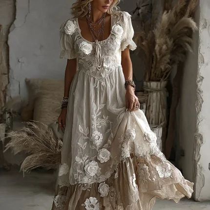 Women’s Rose Embroidery Art V-neck Short Sleeve Maxi Dress