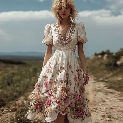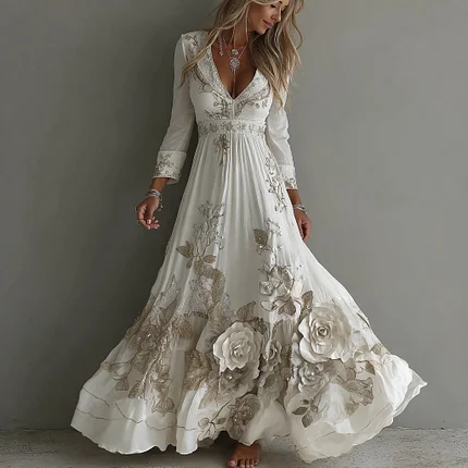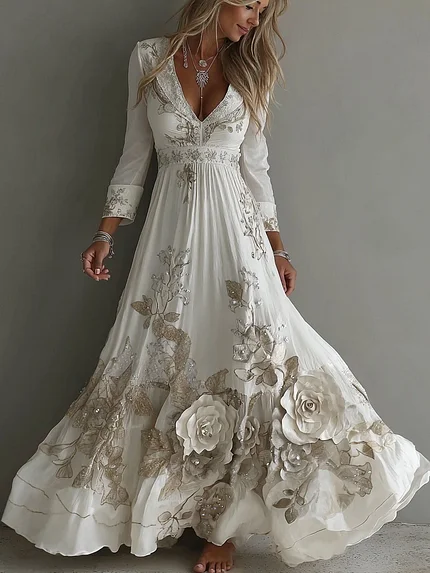 Women’s Vintage White Flowers Embroidery Art V-neck Maxi Dress