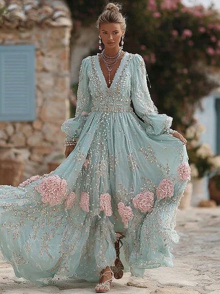 Women’s Floral Art Print V-neck Long Sleeve Maxi Dress
