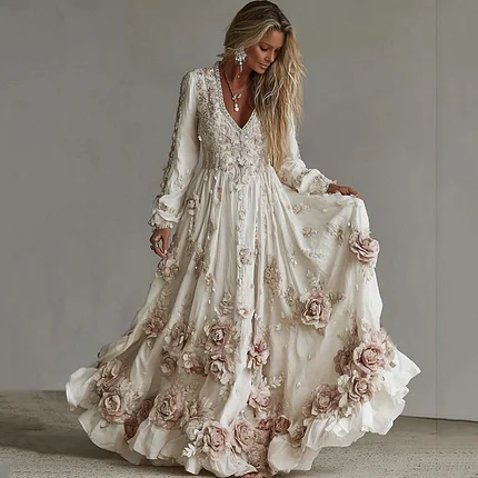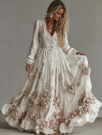 Women’s Vintage Roses Art Print V-neck Long Sleeve Maxi Dress