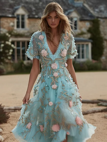 Women’s Vintage Bohemian Floral Sequin Embroidery Casual Maxi Dress