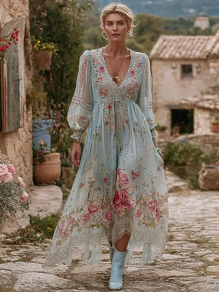 Women’s Vintage Blue Rose Embroidery Long Sleeve Casual Maxi Dress
