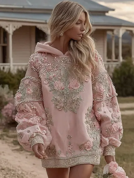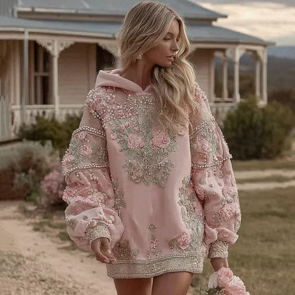 Women’s Vintage Floral Embroidery Art Long Sleeve Hooded Mini Dress