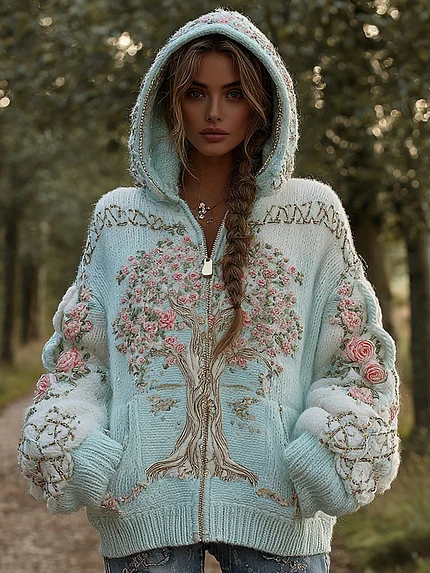 Women’s Viking Pink Rose Tree Of Life Knit Zip-up Hooded Sweater