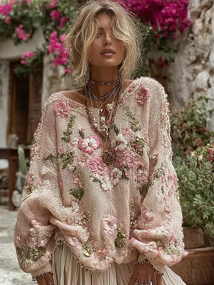 Women’s Boho Floral Chunky Knit Crew Neck Sweater