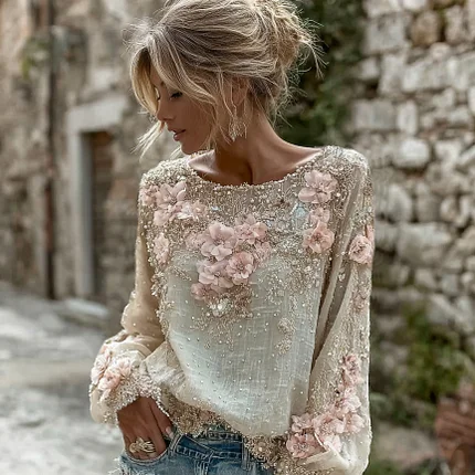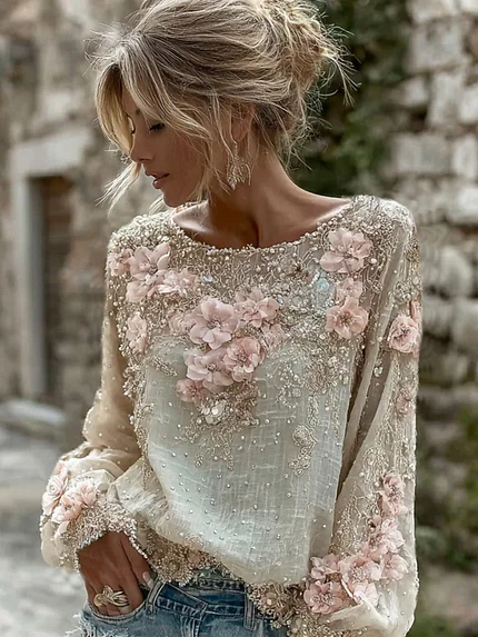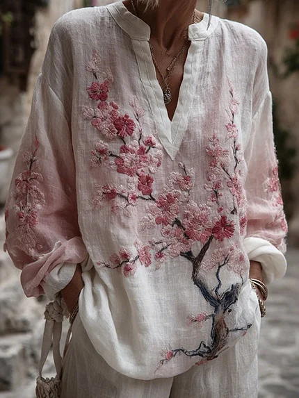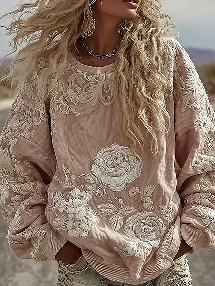 Women’s Vintage Pink Flower Embroidery Art Long Sleeve T-shirt