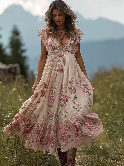 Women’s Vintage Pink Floral Art Linen V-neck T-shirt