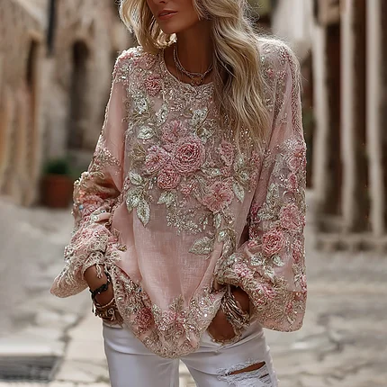Women’s Vintage Pink Flower Embroidery Art Round Neck Long Sleeve T-shirt