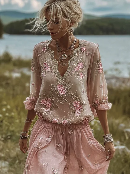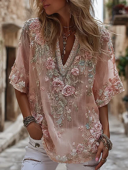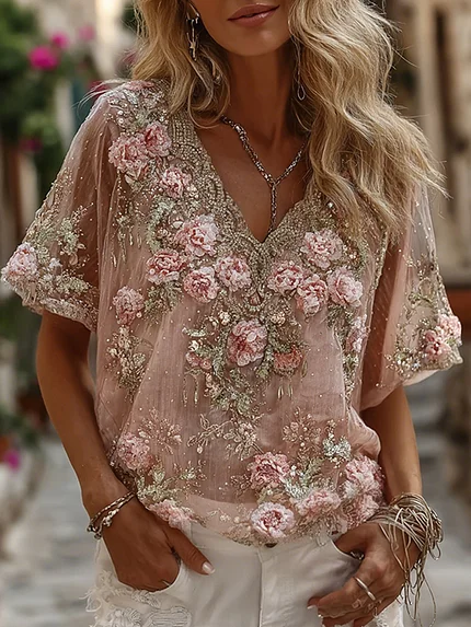 Women’s Vintage Pink Flowers Embroidered Art V-neck Short Sleeve T-shirt