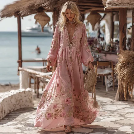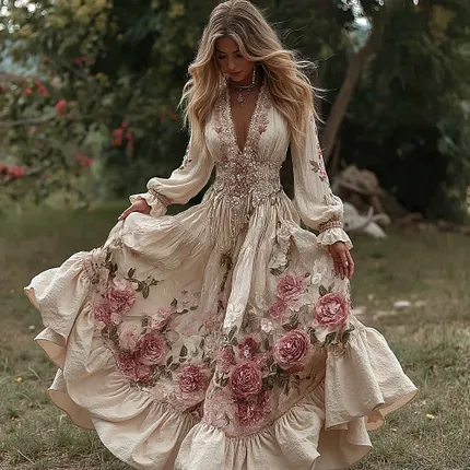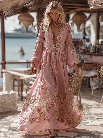 Women’s Bohemian Style Rose Long-sleeved V-neck Dress