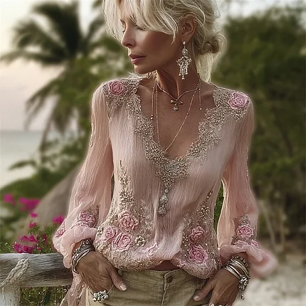 Boho Pink Roses Glitter Lace Flowy Linen Tunic