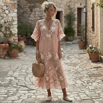 Women’s Retro Floral Embroidery Art V-neck Short Sleeve Midi Dress
