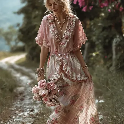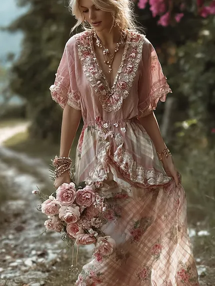 French Romantic Bohemian Style Patchwork Plaid Rose Dress