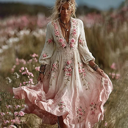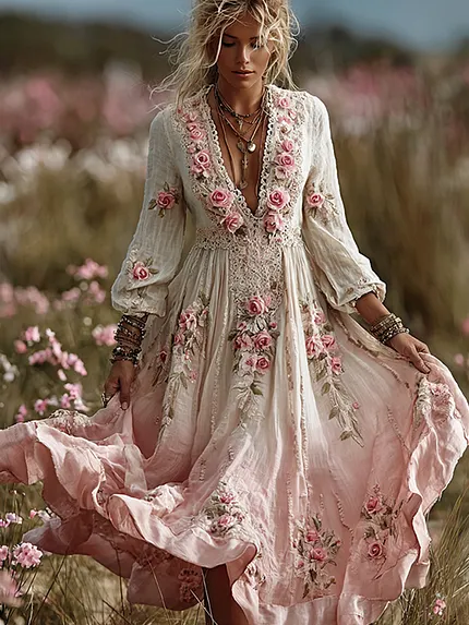 Women’s Bohemian Rose Lace Gradient V-neck Maxi Dress