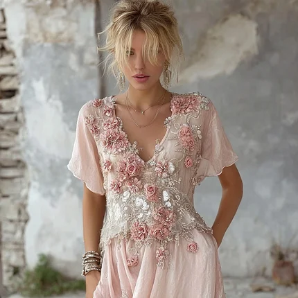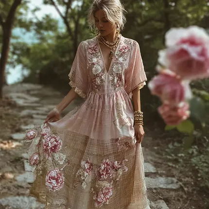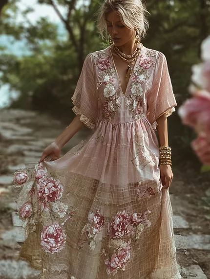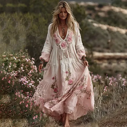 Women’s Bohemian Rose Lace V-neck Maxi Dress