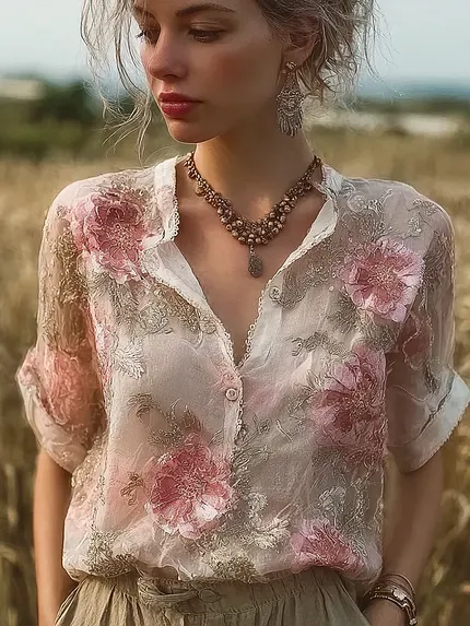 Bohemian Retro Countryside Style Plant Flower Design Cotton And Linen Women’s Long-sleeve Shirt