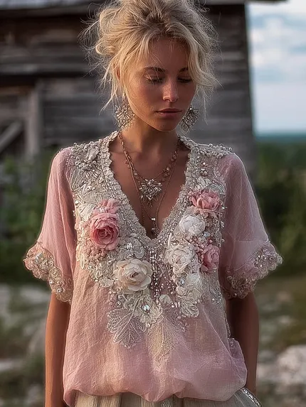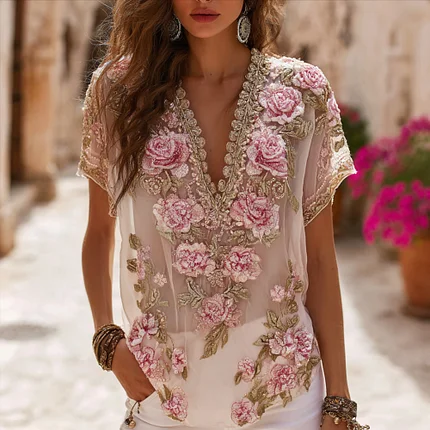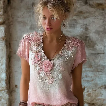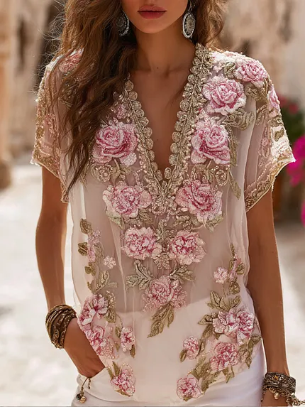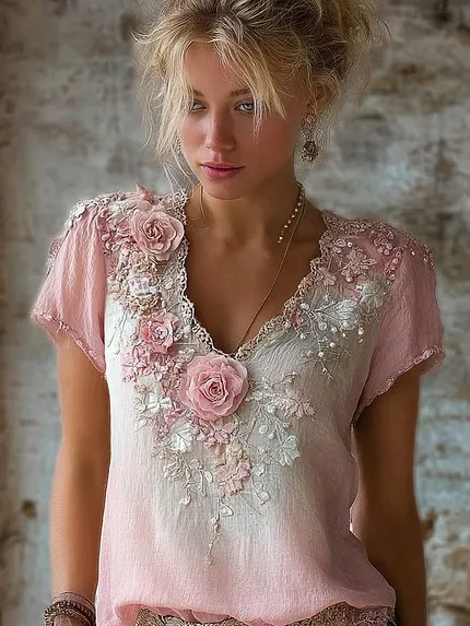Women’s Bohemia Pink Roses Embroidered Art V-neck Short Sleeve Linen Blend T-shirt