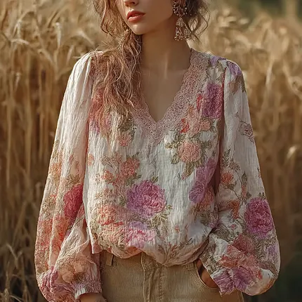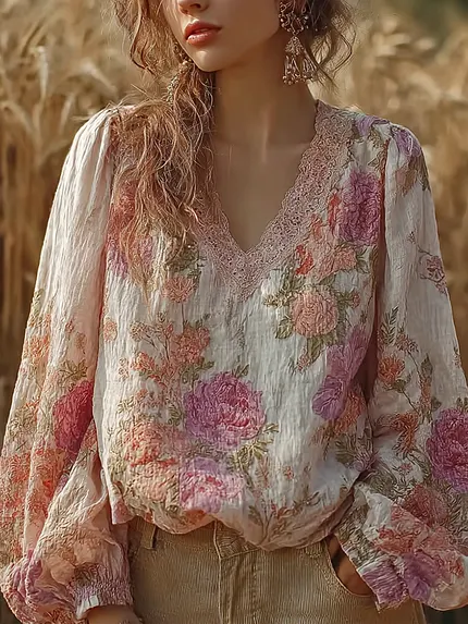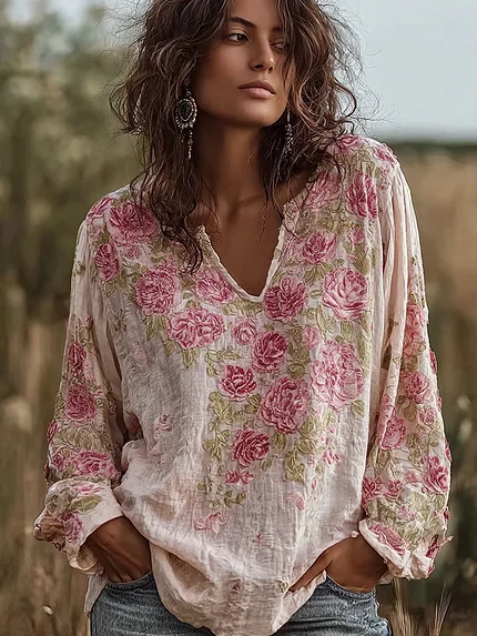 Bohemian Retro Countryside Style Plant Flower Design Cotton And Linen Women’s Long-sleeve Shirt