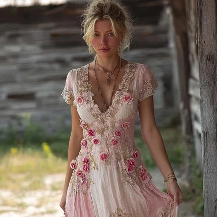 Vintage Boho Pink Roses Embroidered Flowy Maxi Dress