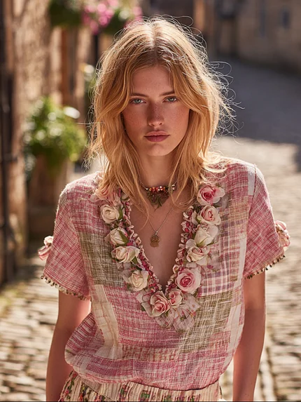 Women’s Bohemian Rose Floral Print Patchwork Art Short Sleeve