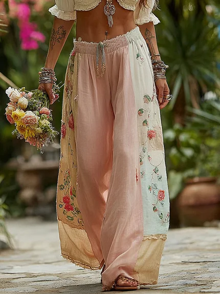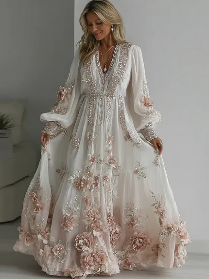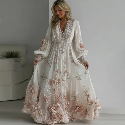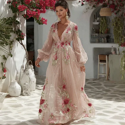 Vintage Boho Pink Roses Embroidered Lace Flowy Linen Maxi Dress