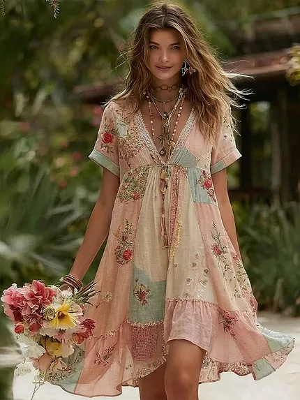 Women’s Bohemian Patchwork Casual Vacation Short-sleeve Dress