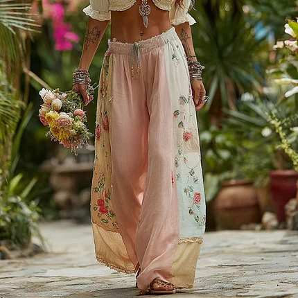 Boho Pink Roses Lace Flowy Linen Maxi Dress