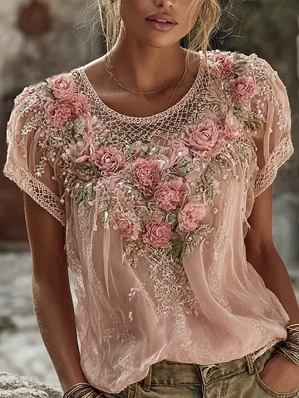 Women’s Floral Embroidered Art Flowy Linen Blend Short Sleeve Casual Tops