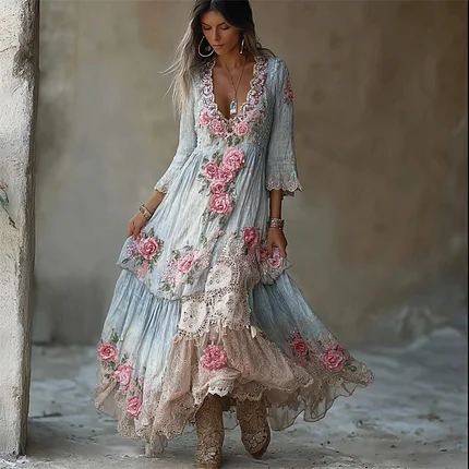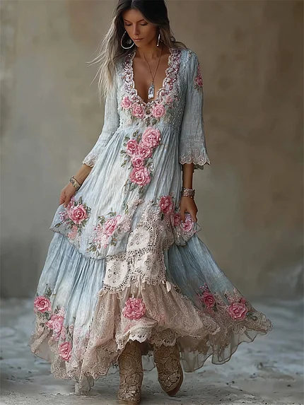 Vintage Boho Pink Roses Lace Flowy Linen Maxi Dress
