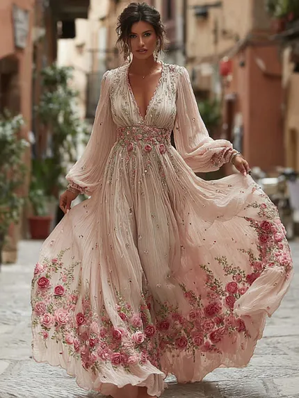 Women’s Bohemian Pink Rose Embroidery Art V-neck Long Sleeve Top