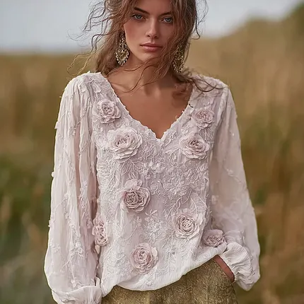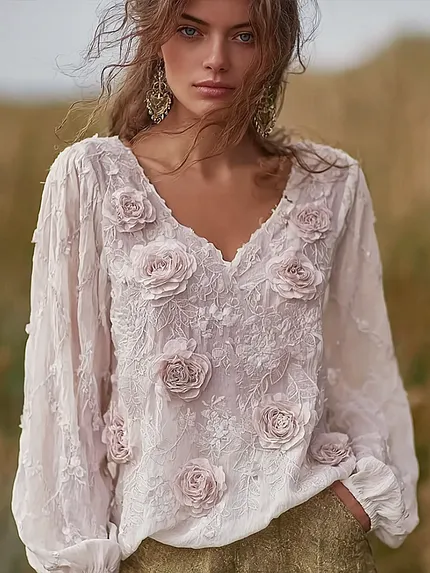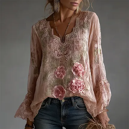 Bohemian Retro Countryside Style Plant Flower Design Women’s Linen Long-sleeve Top